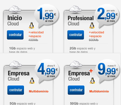 Plan Inicio Cloud: 1Gb espacio web y base de datos, 5Gb de transferencia mensual, 10 buzones de correo x 1Gb x buzón, Php 5.0 + MySQL 5 ilimitadas. (por sólo 1,99€ al mes)